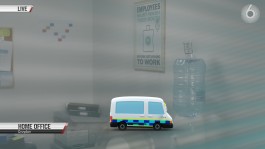 The moving image segments of Channel 6 oscillate from places of power, such as the media’s portrayal of the Royal Family, to sites of resistance where bystanders, by collective compassion and force, challenge Immigration Enforcement. One of the key characters in the exhibition is an anthropomorphic immigration van developed in collaboration with 3D illustrator Tadeo Soriano. The segments use a mix of appropriated news footage, bystander’s recording of a violent event, and stock video, images, and 3D models.